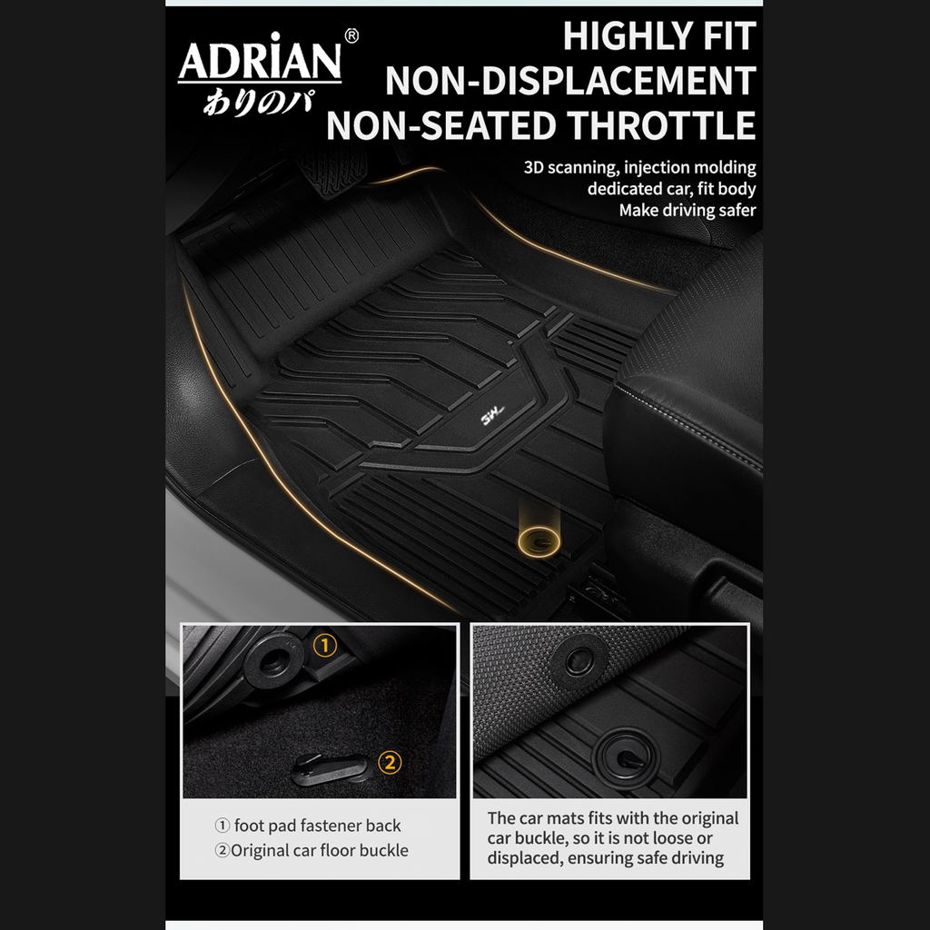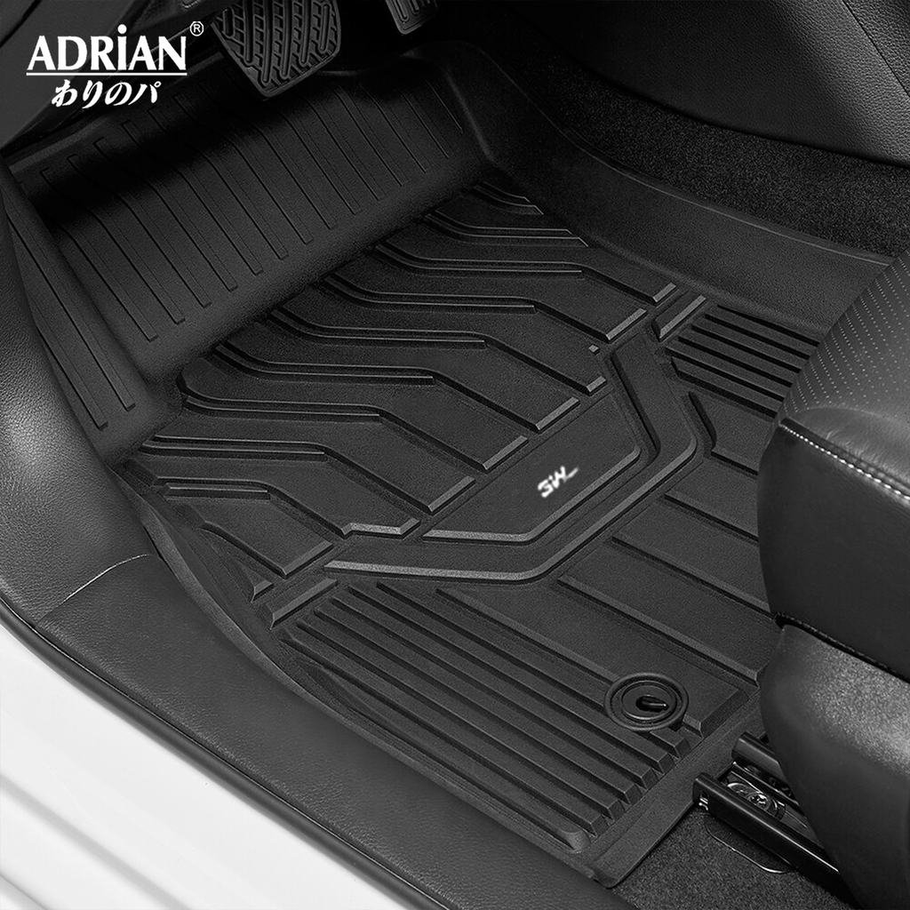 Adrian floor liners are made from 100% Brand-new Thermoplastic Elastomer (TPE), which is extremely elastic and wearable. It has a comfortable feeling of feet, prevent accidental skidding even when your feet are wet. The unique groove design also increases the friction of the mat, maintaining excellent durability even with prolonged use